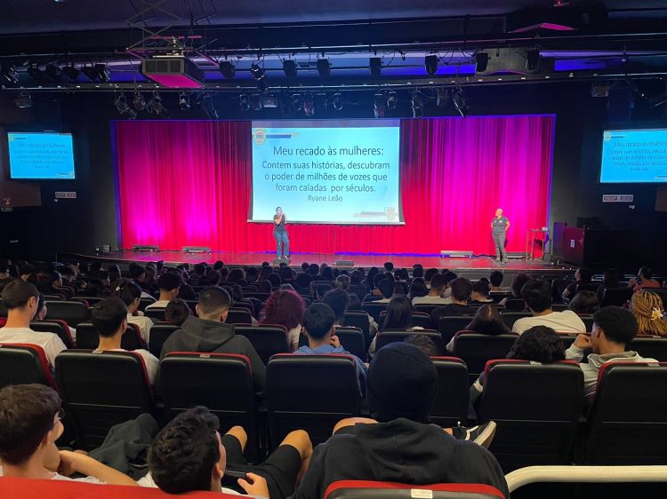 Na última sexta-feira, 30 de agosto, o CE 410 - Escola Waldemar Verdi Junior, em São José do Rio Preto, promoveu uma atividade especial para seus estudantes do Ensino Médio, com o intuito de mobilizá-los em torno da campanha Agosto Lilás. O evento ocorreu no teatro SESI e contou com a presença de especialistas no combate à violência de gênero. Aline Batista Rodrigues Fernandes e Marimile Marise Balthazar, investigadoras da Delegacia de Polícia de Defesa da Mulher (DDM), e Bruna Thaise Alves da Silveira, psicóloga do Centro de Referência e Atendimento à Mulher, foram os convidados que compartilharam seus conhecimentos e experiências com os alunos. A ação foi organizada por Carlos Eduardo Ap. Pereira da Silva, orientador educacional; Débora Cristina Soares Silva, diretora da escola; e Carlos Roberto dos Reis, coordenador pedagógico.
