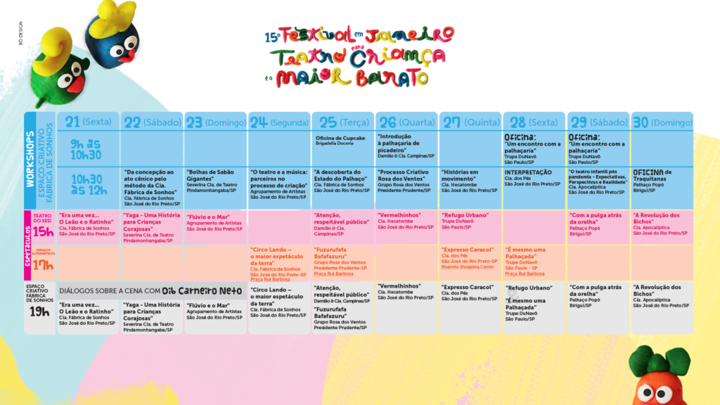 Entre os dias 21 e 30 de janeiro, acontece a 15ª edição do “Festival Em Janeiro Teatro para Criança é o Maior Barato”. As apresentações presenciais serão no Teatro do Sesi São José do Rio Preto, sempre às 15h, e em outros espaços da cidade. Além disso, as peças serão retransmitidas pelo canal da Cia. Fábrica de Sonhos no YouTube.